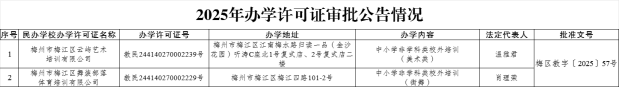 根据《中华人民共和国民办教育促进法》《中华人民共和国民办教育促进法实施条例》以及相关法律法规,我局依法受理了梅州市梅江区云屿艺术培训有限公司、梅州市梅江区舞装部落体育培训有限公司等2家培训机构办理民办学校办学许可证的申请,经审核,依法予以许可,相关信息公告如下: