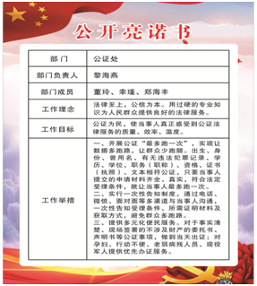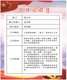 二、履职“亮诺”。区司法局各部门明确工作目标,提出工作举措,将承诺事项融入岗位职责、化为岗位行动,形成《公开亮诺书》挂墙作战,接受干部群众监督。