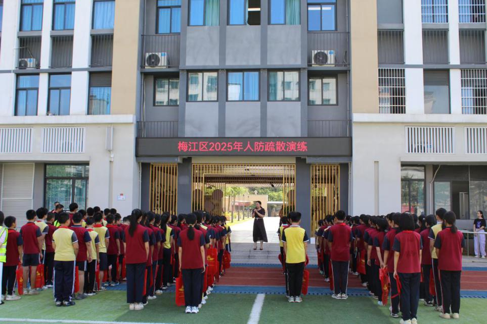 国无防不立,民无防不安。为深入贯彻《中华人民共和国人民防空法》,进一步增强市民的国防观念与人防意识。根据市国动办工作部署,梅江区国动办(人防办)和梅江区教育局以“9.18”防空警报试鸣为契机,组织开展2025年人防疏散演练活动。