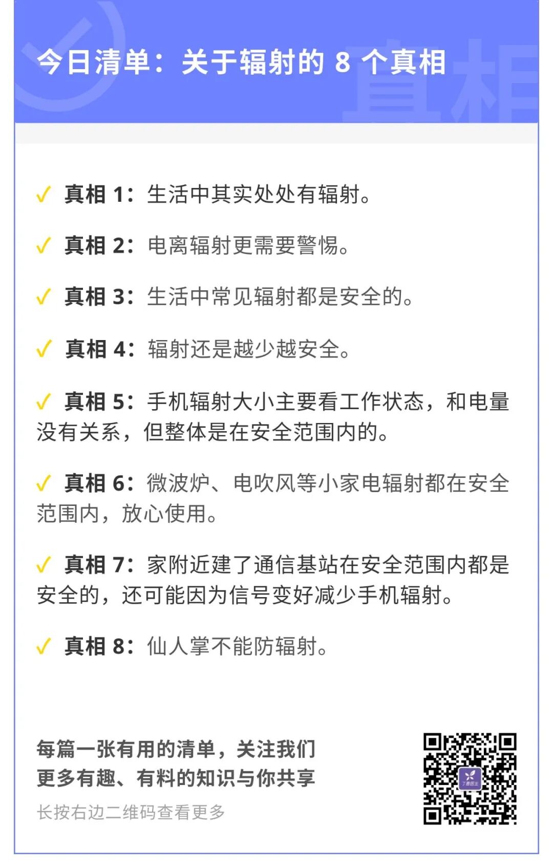 02 02 真相二:电离辐射更需要警惕 真相 相比于上面说到的非电离辐射,电离辐射的能量较强,通过能量传递引起物质电离,如 α 粒子、β 粒子、质子、中子、X 射线和 γ 射线等。 你一定听过福岛核电站事故、切尔诺贝利事件,它们都是电离辐射。这类事故所造成的环境影响危害性是很大的。 日常生活中当然不会遇到这样高剂量的电离辐射,但我们也无法完全逃离它。 来自宇宙的射线,土壤中的氡气,装修用的天然大理石,还有地铁安检时的安检仪,接受医疗检查的 CT,都存在电离辐射。 生活中常见的电离辐射量,大概是这样的: 有危险的电离辐射在生活中相对容易辨识,如果在生活中看到这个标识,请务必离远一点再远一点! 图片来源:图虫创意 03 03 真相三:生活中常见辐射都是安全的 真相 目前世界卫生组织、国际癌症研究机构和国际非电离辐射防护委员会以及欧盟执委会的新兴与新鉴定健康风险科技委员会发表的一系列报告均指出: 目前没有得到充分的证据能够证明在一般强度下的电磁曝露会引起癌症在内的恶性疾病。 在国际癌症研究机构的致癌物分类中,电磁辐射分别位于 2B 类致癌物和 3 类致癌物。 千万不要因为 2B 类致癌物而担心,它指的是「可能性较低的致癌物」,同为 2B 类致癌物的还有泡菜和咖啡。 相比于害怕手机辐射,不如多注意一下明确会致癌的 1 类致癌物,例如烟草、阳光、汽车尾气、腊肉。 图片来源:图虫创意 04 04 真相四:辐射还是越少越安全 真相 既然大部分都是安全的,也没有明确的致病风险,那我们还需要重视辐射吗? 答案是:需要。 虽然以目前的认知水平和流行病学调查研究得出了弱关联性的结论。 但从辐射防护本身而言,我们应该做到一个「最优化原则」: 在充分考虑了经济和社会因素之后,使辐射水平保持在可合理达到尽可能低的水平(ALARA, as low as reasonably achievable)。 在不影响正常生活的前提下,尽量减少在辐射环境中曝露的时长和强度,降低可能存在中的潜在风险。 简单来说,我们可以做的三件事是:减少曝露时间、增大与辐射源的距离以及采取必要的屏蔽防护。 举例来说,如果是在备孕或怀孕期间,的确应该减少由于医疗等电离辐射所带来的影响,可以更好地降低潜在风险。 但在必要的时候,可以遵循医生的建议,在做好相应防护措施的情况下,进行低剂量的检查。 生活中我们会遇到很多关于辐射的谣言,这次一起辟掉吧。 01 01 谣言一:手机电量低,辐射强 真相 手机是目前与我们生活关联最大的电磁辐射发射体,它通过向周围移动通信基站(路由器)发射和接收电磁波,以达到无线通信的目的。 在通信的过程中,不可避免地会产生电磁辐射。 不过,手机的发射功率,主要看工作状态: 辐射大小,与手机电量没有关联。 如果实在担心,那在需要长时间打电话时,不妨带个耳机以减少头部受到手机辐射的影响。 图片来源:图虫创意 02 02 谣言二:家附近建了通信基站会有强辐射 真相 不仅不会增加,反而可能会减少! 基站是城市中数量最多的电磁辐射源,它是保障手机通信的必要基础设施。 但网上经常会出现争论和需求:这东西得有,但千万不能建在我家旁边。 其实一般情况下,基站所产生的电磁辐射在几十米外的地方,就能降到环境本底水平。 在保证了一定安全距离的前提下,它对我们的生活没有影响。 假如基站建在了你家楼顶,那你就更不需要担心了。 基站是向外发射电磁波而不是向下发射,在基站正下方反而是电磁辐射最小的地方。 另外,由于周围有了基站后手机信号质量变好,我们手机与基站通信时不需要满功率发射,手机的辐射影响会更小,也会更省电。 图片来源:图虫创意 03 03 谣言三:微波炉、电吹风小家电辐射很强 真相 微波炉加热食物的原理就是我们前面提到的电磁辐射热效应,为了快速加热食物,它的发射功率相对较大。 但微波炉的金属外壳能起到较好的屏蔽作用(辐射防护三要素之一),因此对外界的影响很小。 需要补充说明的是,在实测中发现有部分微波炉存在电磁辐射泄露,所以买电器还是尽量选择品牌的哦。 电吹风与微波炉不同,它是通过电流产生热风,电磁辐射只是个伴生品。 在实测中发现,电吹风所产生的磁场强度确实高于其他家电,但距离标准限值仍然很远,磁场强度大概只是限值的 5%~10%,所以安全是有保证的。 如果仍有顾虑,那就……离远点吹吧。 图片来源:图虫创意、Giphy.com 04 04 谣言四:仙人掌能防辐射 真相 仙人掌除了能扎人,真的没有啥特殊的。 且不说电脑屏幕的辐射非常小,就这一盆小小的植物要是能防辐射,那我们还担心什么电磁辐射呢? 图片来源:Giphy.com 总而言之,我们生活在一个复杂的电磁环境中,生活中的大部分辐射都是安全的,安心啦! 送上今日清单: