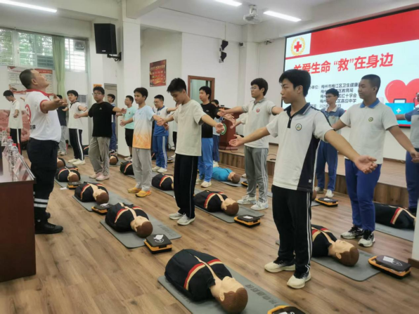 在培训现场,梅州市无偿献血促进阮劲松会长将理论讲解与实际操作紧密结合,深入浅出地传授急救知识。详细讲述了心肺复苏(CPR)、海姆立克急救的操作流程,从判断环境安全到胸外按压、开放气道、人工呼吸,每一步都环环相扣,生动形象。培训结束后,不少师生表示收获满满。