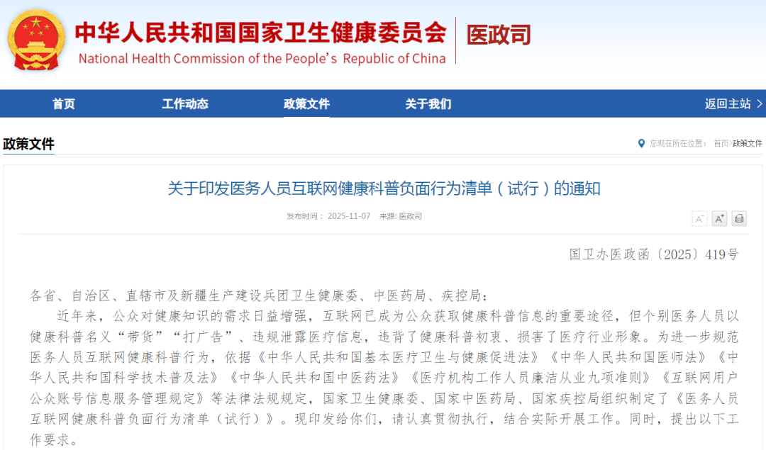 11月7日,国家卫生健康委印发《关于印发医务人员互联网健康科普负面行为清单(试行)的通知》(以下简称《通知》),进一步规范医务人员互联网健康科普行为,更好满足人民群众健康需求。