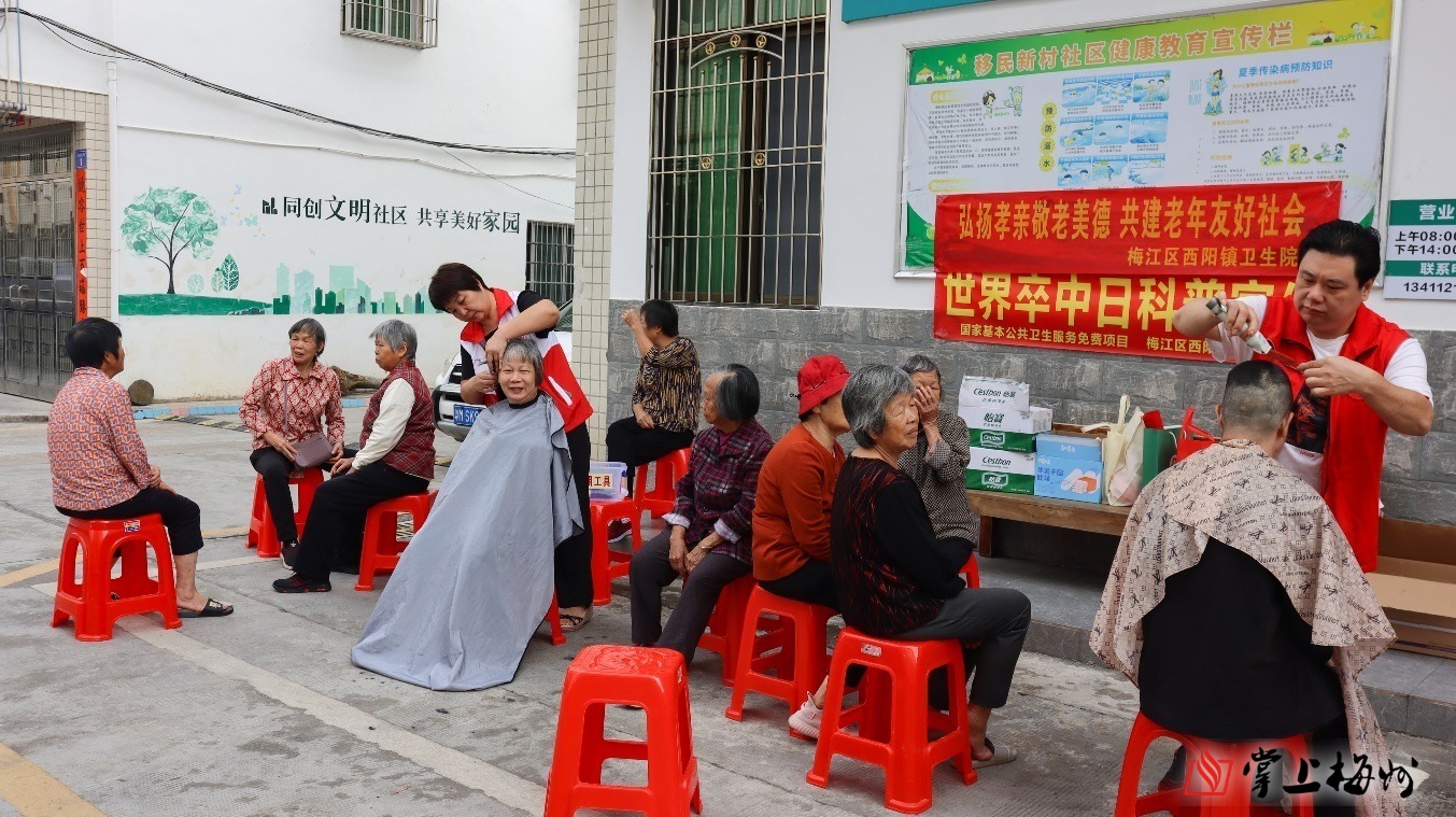 在莆田村健康关怀活动现场,医务志愿者细致地为老人进行免费诊疗,耐心解答他们的健康问题并提供保健建议,专业且贴心的服务深受村民的认可与欢迎。移民新村社区则联合西阳镇社会工作与志愿服务协会为60周岁以上老人提供免费理发服务,以家门口的便民服务、面对面的温情交流,传递着对老人们最真挚的关怀与敬意。