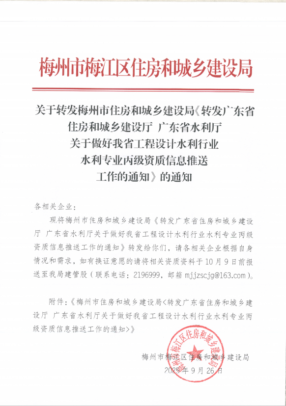 转发广东省住房和城乡建设厅 广东省水利厅关于做好我省工程设计水利行业水利专业丙级资质信息推送工作的通知.pdf